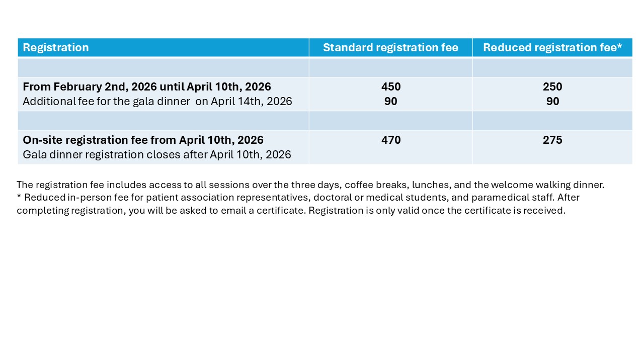 This is a not-for-profit meeting. Based on acquired sponsorship and support we determined the lowest possible registration fee we can offer at this moment. There is a reduced registration fee for young researchers (specialists in training and PhD students, certificate required), allied health care professionals and patients/patient representatives.
